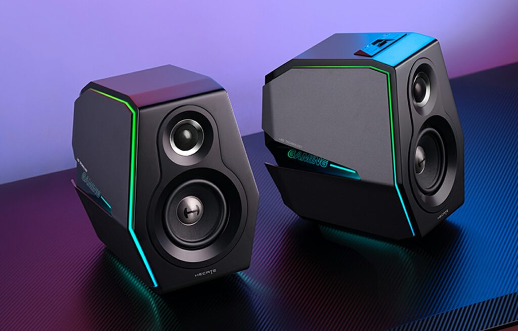 The Edifier G500 is a speaker that will appeal to gamers with it’s appealing Gaming look. Customisable RGB lights have been incorporated into the design. Slightly awkward controls on top of the right speaker connectivity inputs include Bluetooth 5.0 technology, USB, Optical, Co axle input and a 3.5 mm jack input. There is 88 watts of output and a frequency range of 70 hz – 40 khz.